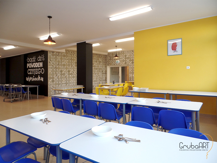 Projekt aranżacji stołówki szkolnej wraz z wykonaniem malunków artystycznych ściennych.